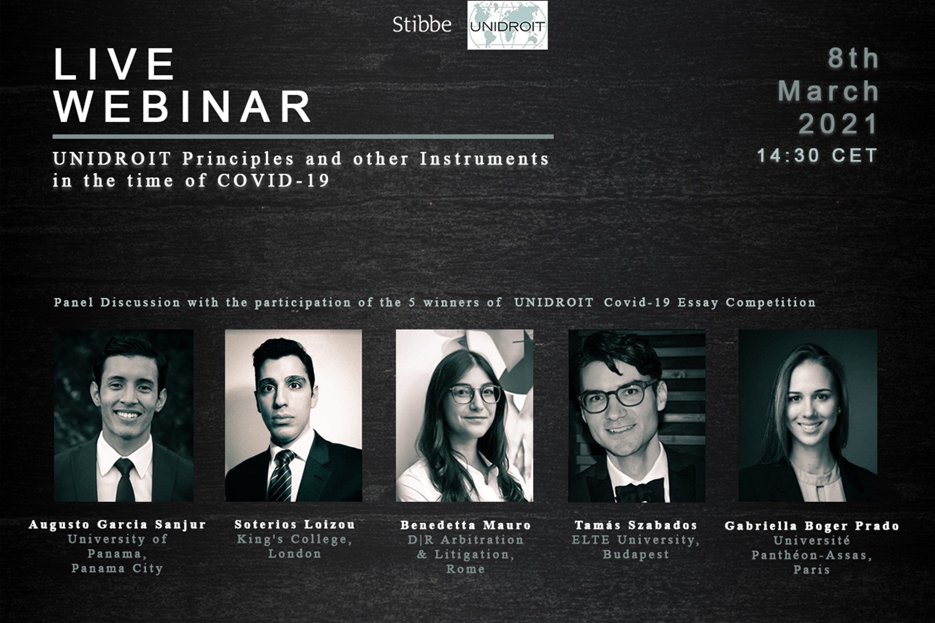 We are pleased to announce the winners of the UNIDROIT COVID-19 Essay Competition, supported by Stibbe, and facilitated by the UNIDROIT Foundation: Augusto Garcia Sanjur, Soterios Loizou, Benedetta Mauro, Tamás Szabados, and Gabriella Prado.