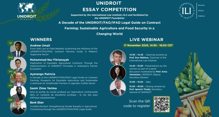 Keni Kariuki works as a Legal Consultant/MAECI Chairholder at UNIDROIT. He is mainly responsible for assisting in the “Private Law and Agricultural Development” projects jointly developed with IFAD and FAO (Collaborative Legal Structures for Agricultural Enterprises, Agricultural Land Investment Contracts and Contract Farming). Keni holds a Ph.D. in Agricultural Political Economy from SOAS University of London (United Kingdom), a Master’s degree in International Human Rights Globalisation and Justice from Keele University (United Kingdom), he completed his Bar Vocational Course (BVC) at Nottingham Trent University (United Kingdom), and has a Bachelor of Laws (LLB) in Law and Politics (Dual Degree) from Keele University. Before joining UNIDROIT, he worked for the African Union Commission (AUC) and as a consultant for other multilateral actors such as Gesellschaft für Internationale Zusammenarbeit (GIZ), FAO, and Bread for the World, among others.
