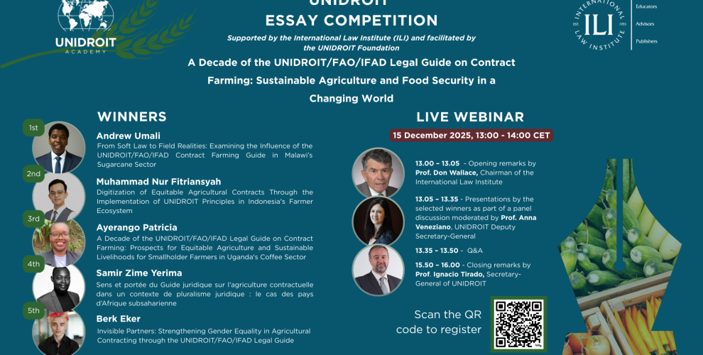 Priscila Pereira de Andrade works as a Legal Officer at UNIDROIT. She is mainly responsible for the Agricultural Development and Private Law projects jointly developed with IFAD and FAO (Legal Structure of Agricultural Enterprise, Agricultural Land Investment Contracts and Contract Farming). Priscila holds a Ph.D. in International Law from the University Paris I Panthéon-Sorbonne (France), a Master Degree in International Relations from the University Center of Brasília (Brazil), and a specialisation degree in International Environmental Law from the United Nations Institute for Training and Research (UNITAR). Before joining UNIDROIT, she worked for the International Institute for Sustainable Development (IISD) and was an assistant professor at the University of Pisa (Italy), as well as an associate professor at the Master in Law Program of the University Center of Brasília.
