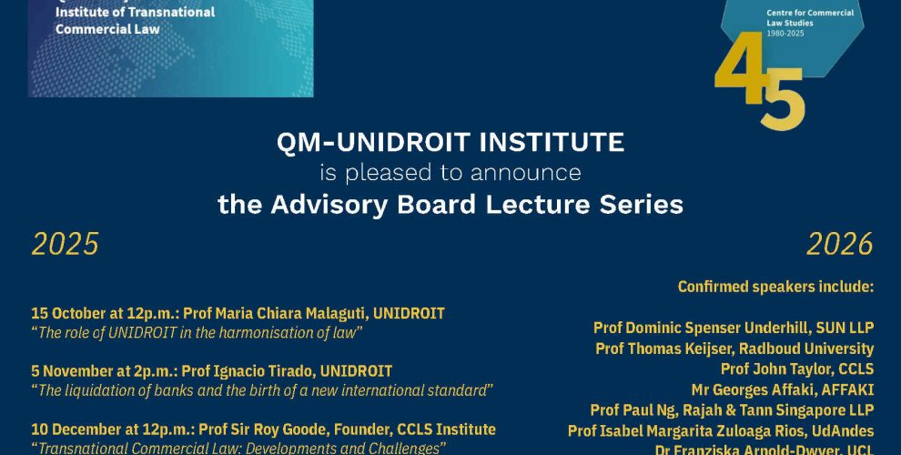 On 15 October 2025, the QMUL-UNIDROIT Institute of Transnational Commercial Law Advisory Board Lecture Series will be launched with an opening lecture by Professor Maria Chiara Malaguti on “The role of UNIDROIT in the harmonisation of law”.